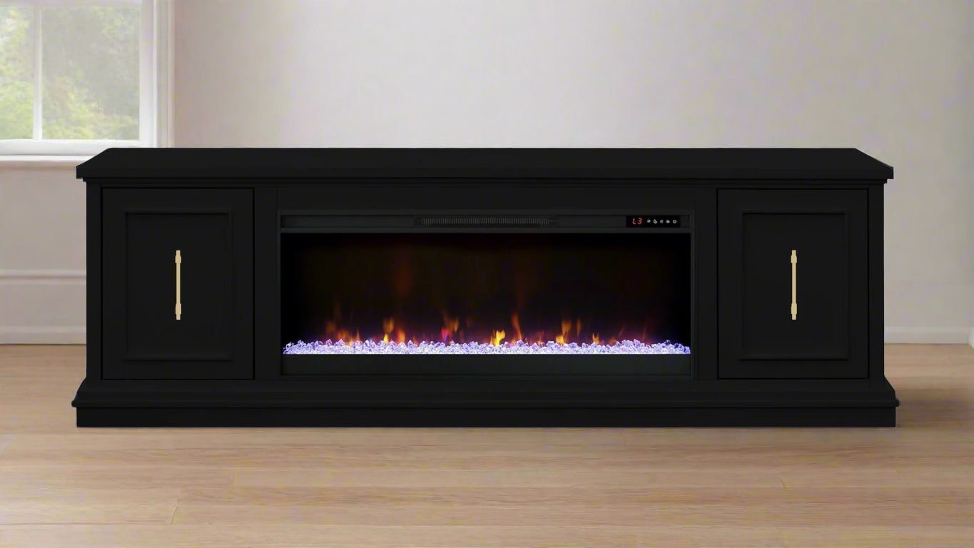 Bring warmth and modern elegance to your living space with the 82" Jordan Sealskin Electric Fireplace by Legends. Finished in a sleek black sealskin tone with gold hardware accents, this piece features a powerful fireplace insert with realistic flame effects and a crystal ember bed—perfect for cozy ambiance and stylish storage.