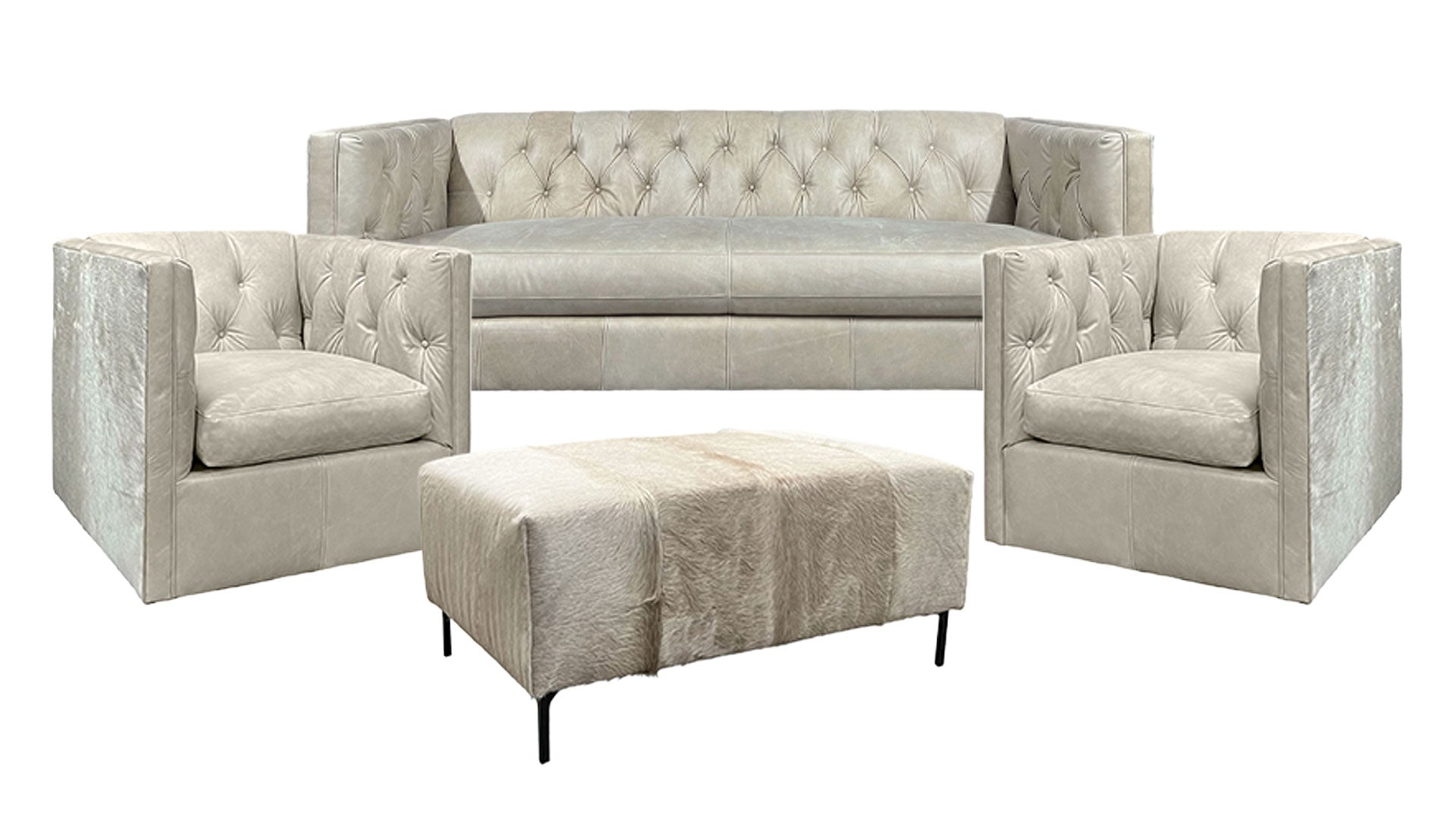 Bermuda Champagne Hair On Hide Leather Sofa, 2 Swivel Chairs & Ottoman