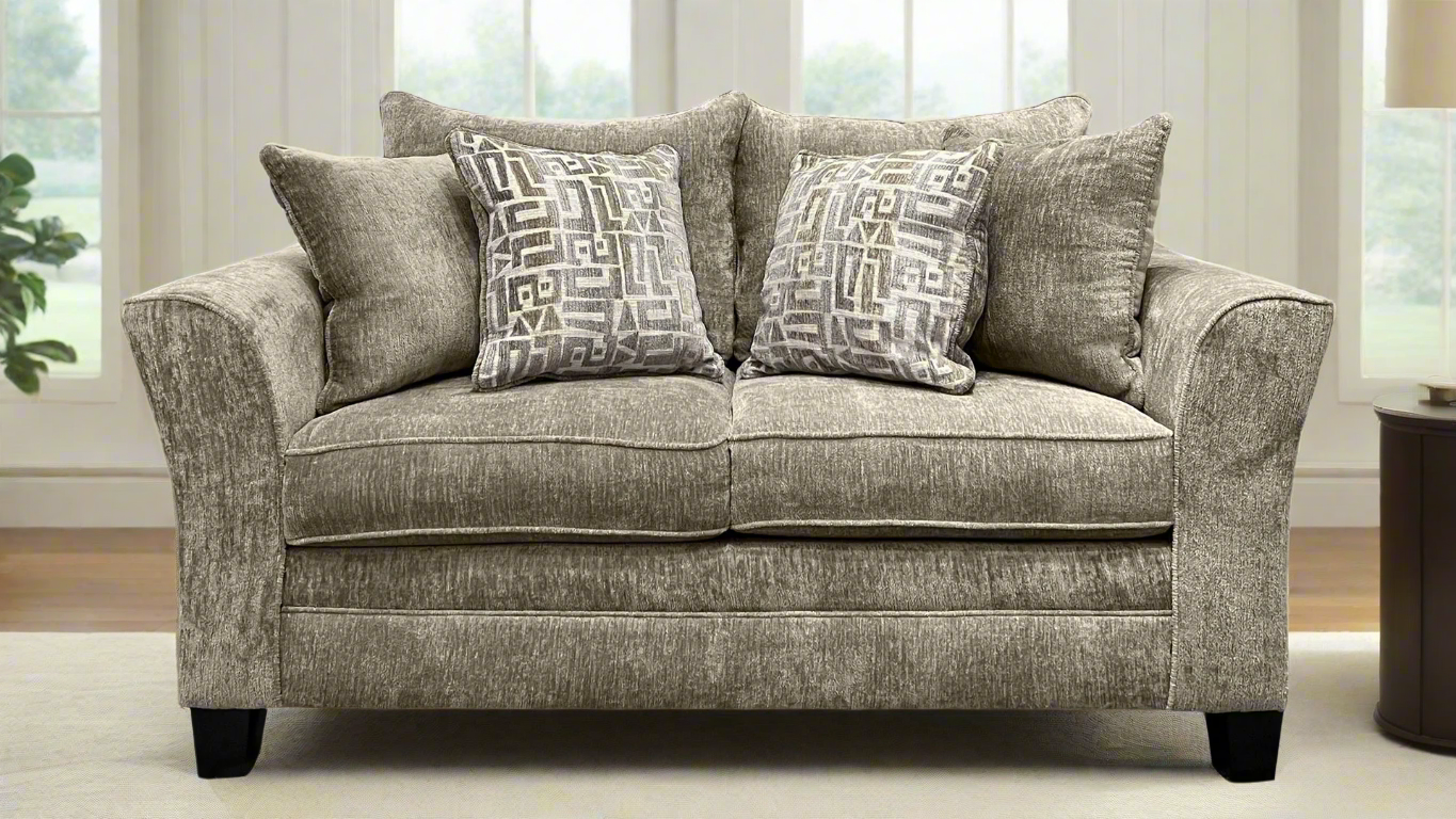 Enjoy exceptional comfort and style with this spacious, American-made loveseat featuring plush cushions and gently flared arms. Upholstered in durable, soft-touch neutral fabric and accented with chic geometric pillows, this loveseat effortlessly blends inviting comfort with sophisticated charm.