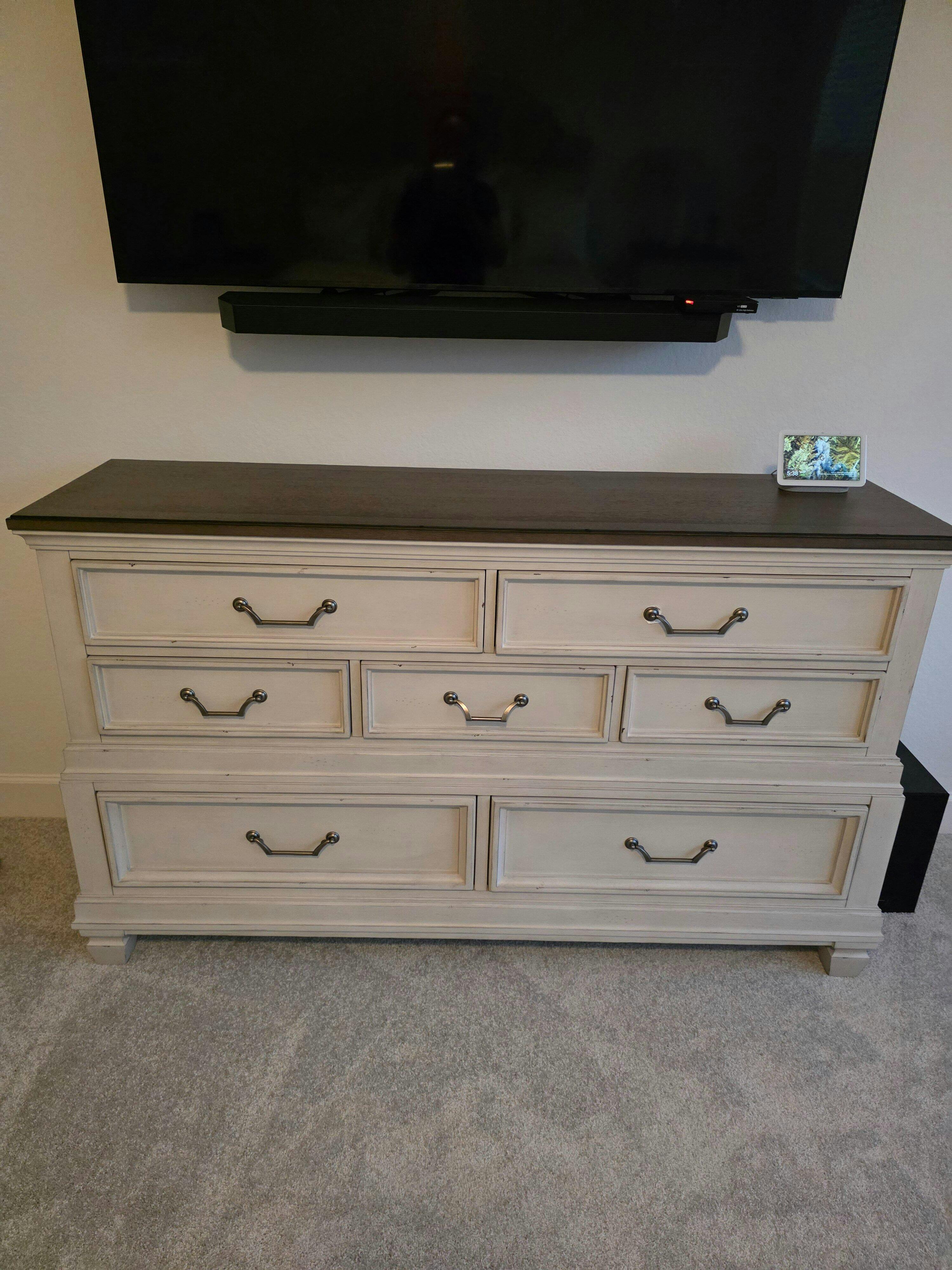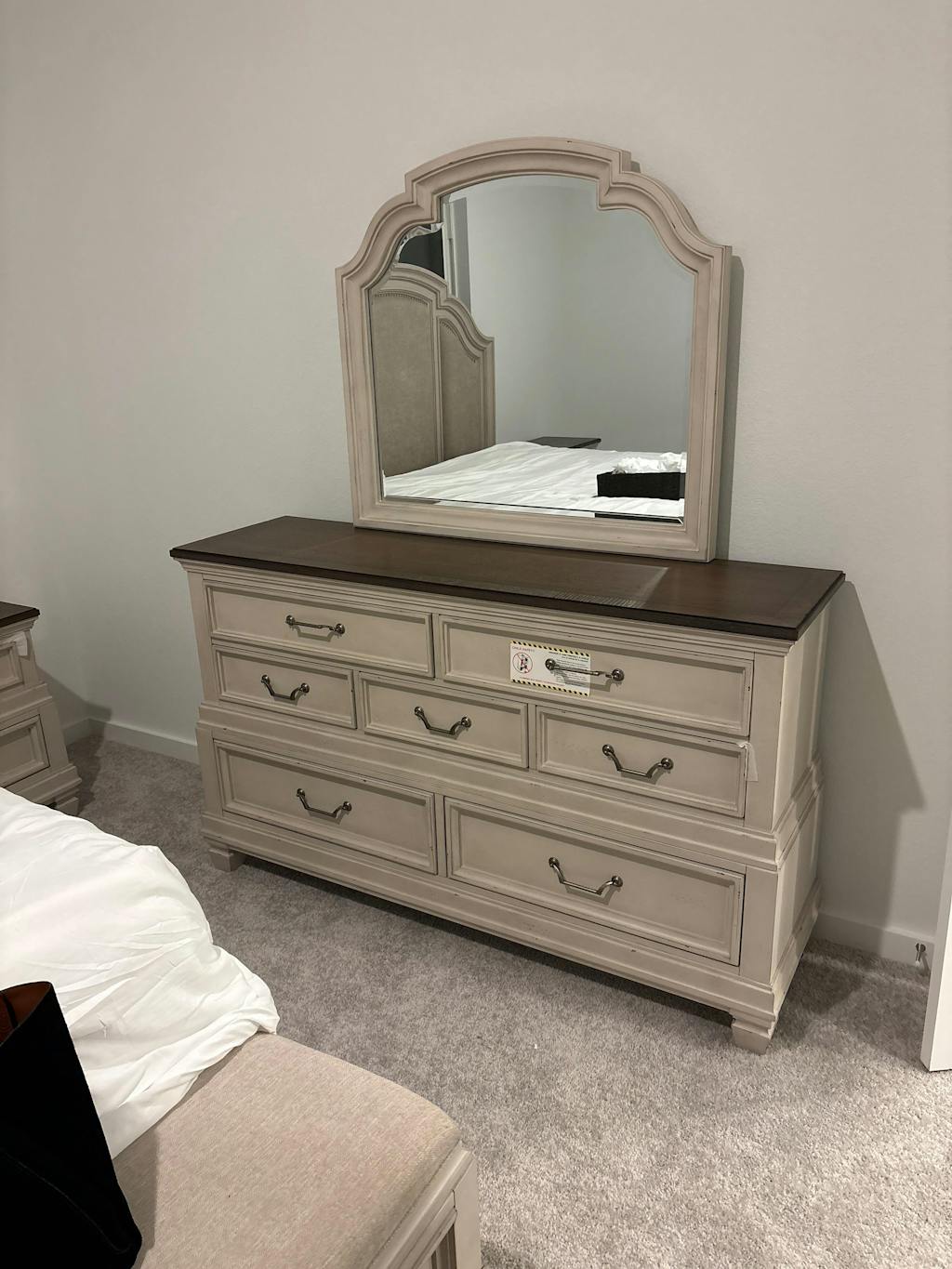 Description: This elegant 7-drawer dresser features a striking two-tone finish, with a rich brown top and a distressed white body that exudes a shabby chic charm. The dresser is adorned with sleek metal hardware and is paired with a beveled mirror that boasts a scalloped frame top, adding a touch of timeless elegance to any bedroom.