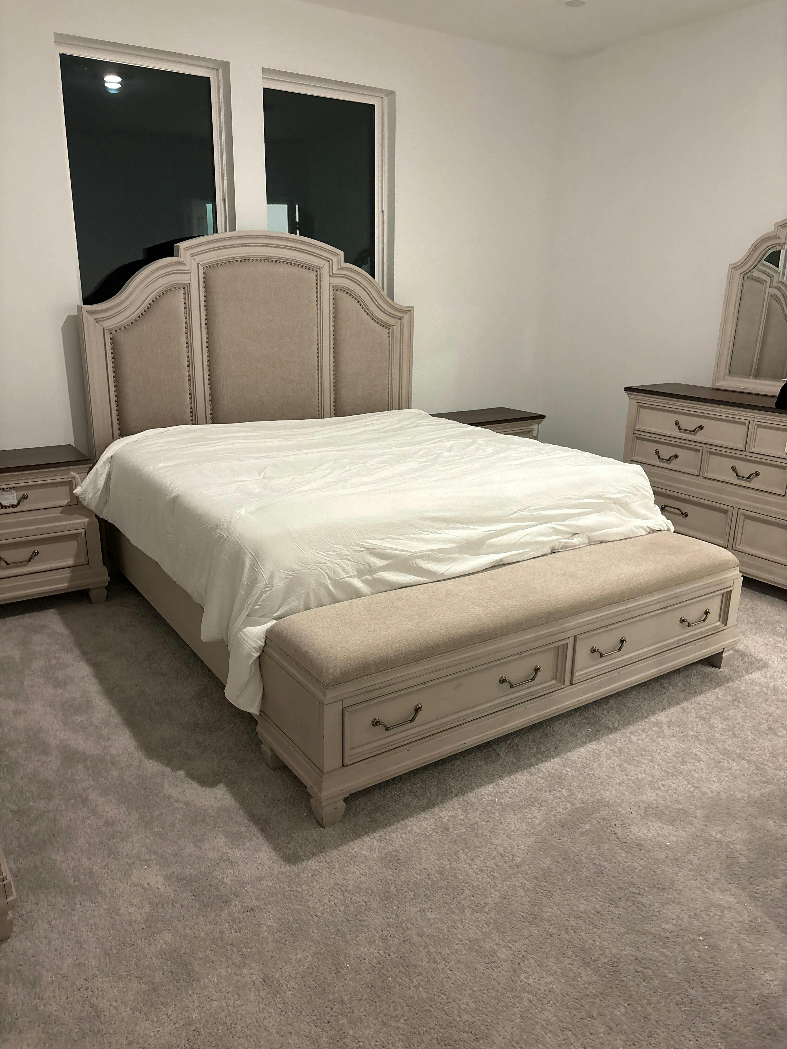 Description: This luxurious king bed exudes sophistication with its headboard featuring three upholstered panels adorned with elegant nailhead trim. The design is complemented by a functional upholstered storage bench at the footboard, complete with two spacious drawers accented by sleek metal hardware, blending style and practicality seamlessly.