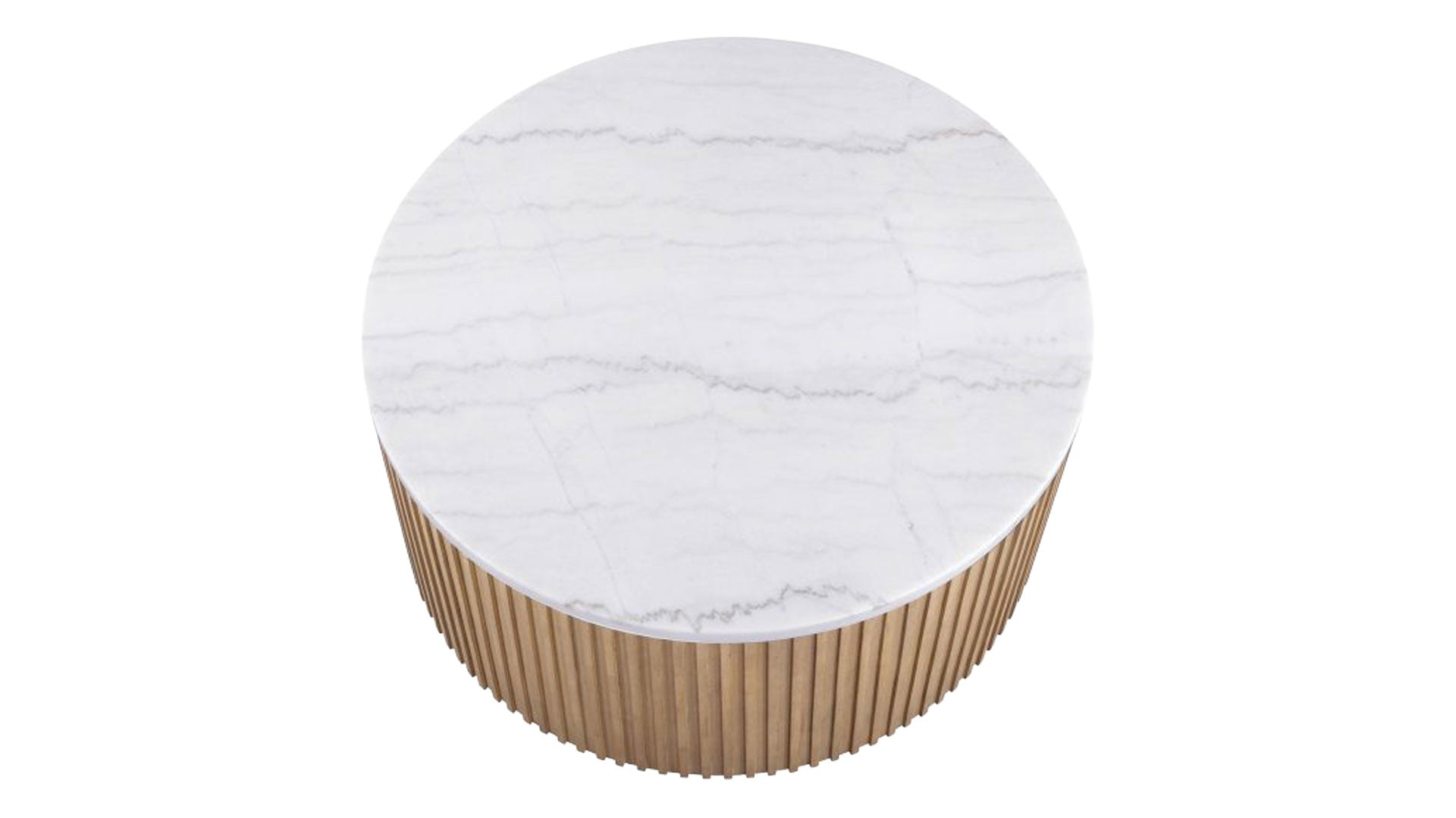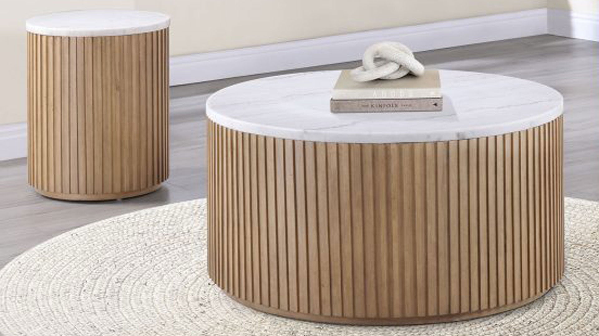 Inspired by Art Deco and Empire styling, the Colvin 36″ Round Coffee Table adds refined elegance to any space. Its oak-veneered top in a warm toffee finish and reeded base bring timeless sophistication, ideal for those who appreciate sleek design. Featuring casters for easy mobility, this table is perfect for repositioning in front of a sofa or moving for cleaning. The spacious round top offers ample room for decor or essentials, combining luxury, practicality, and versatility to elevate your home’s style.