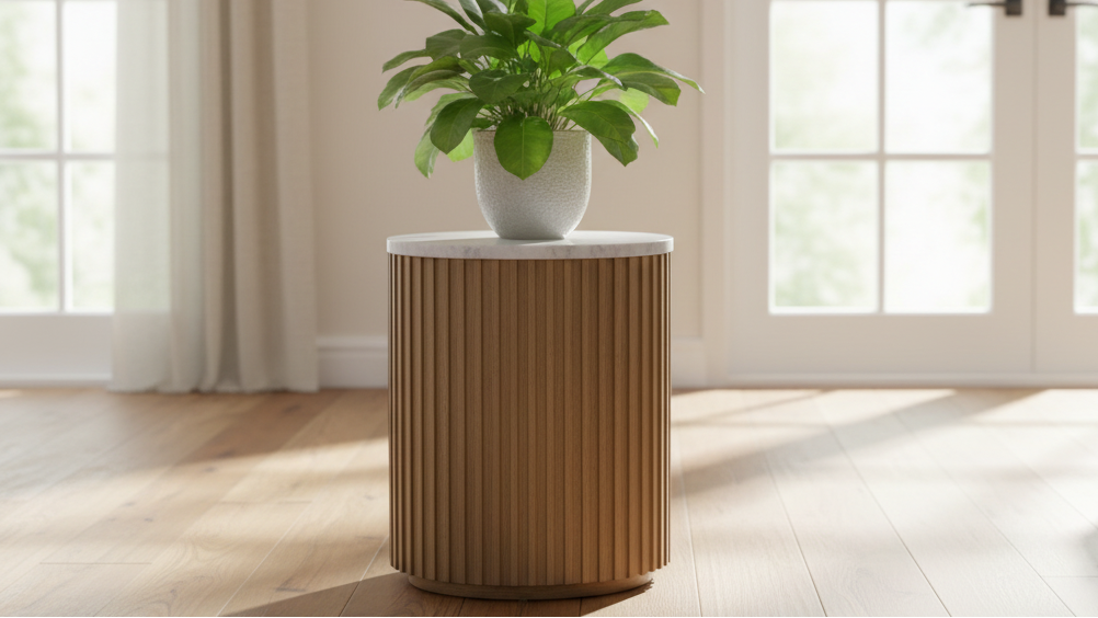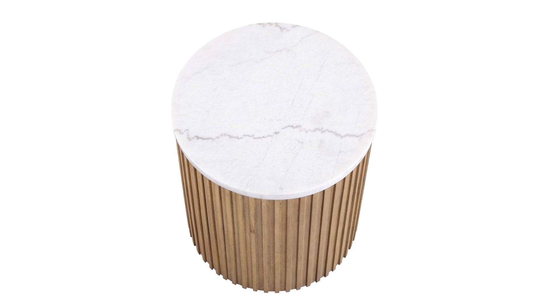 Inspired by Art Deco and Empire styling, the Colvin 18″ Round White Marble End Table brings modern elegance to any space. Featuring a stunning white marble top paired with a warm toffee base, it radiates sophistication and beauty, perfect for those who appreciate refined design. This versatile piece is ideal as a side table companion or at the end of a sofa, effortlessly blending style and functionality. With its reeded base and spacious round top, the Colvin End Table offers ample room for living room essentials, combining timeless design with practical utility.