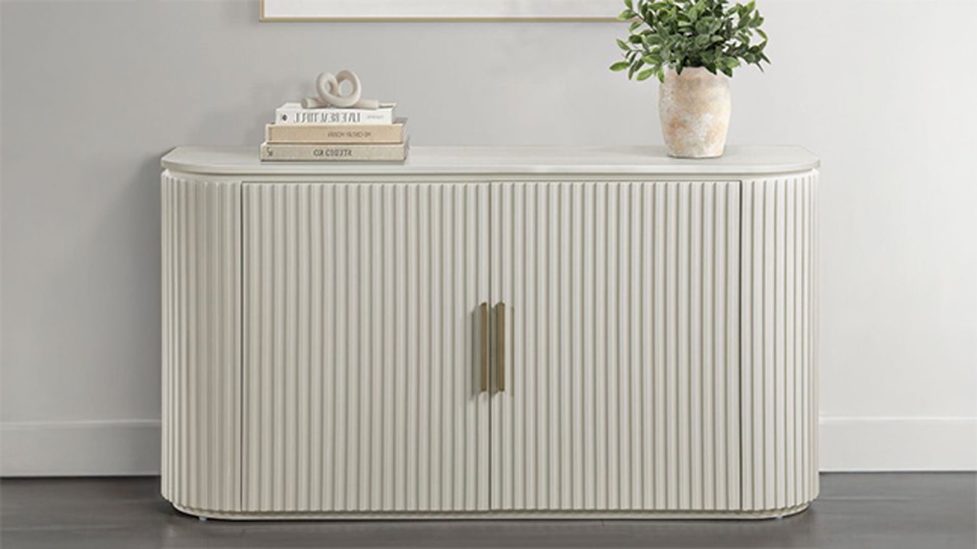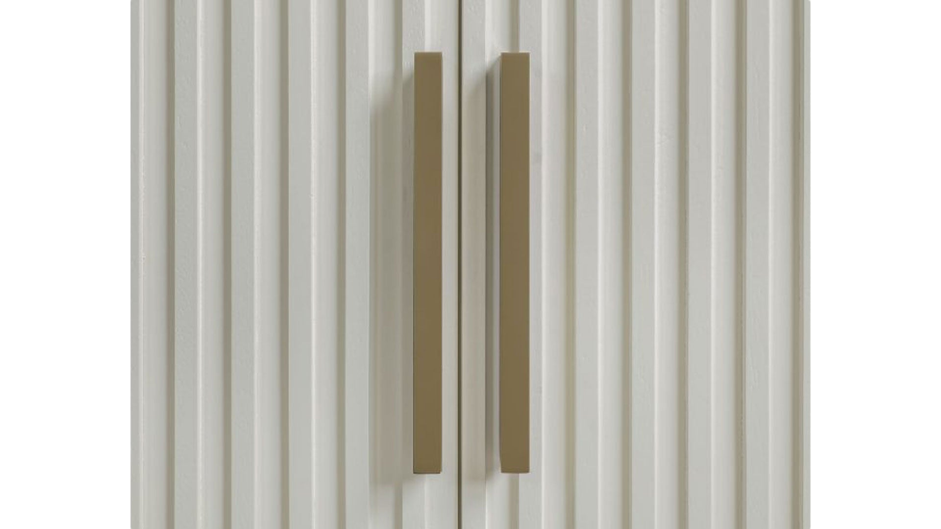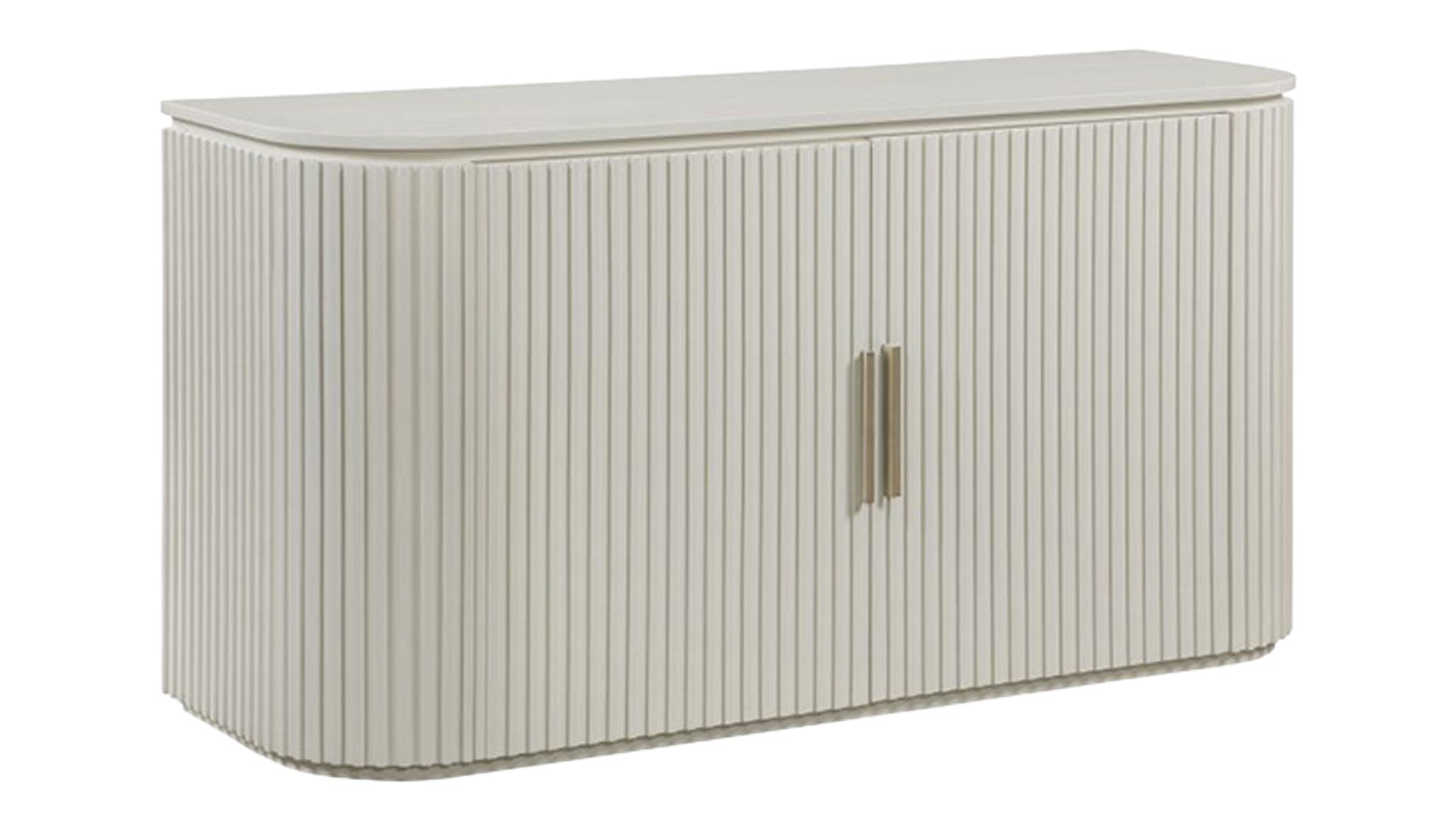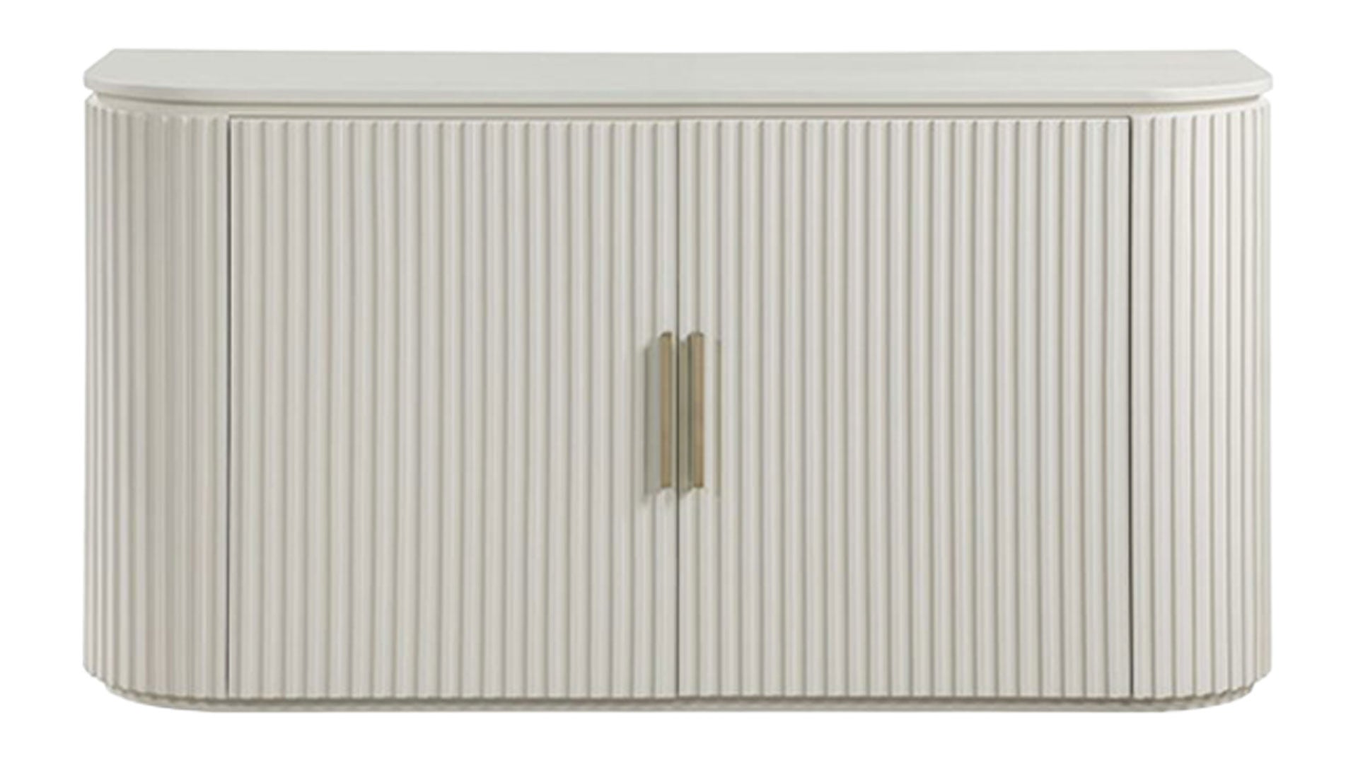 Bring modern, old-Hollywood-inspired style to your dining space with the Colvin White Server. Rounded, reeded doors, satin brass hardware, and concealed European hinges create a clean, upscale look—while adjustable shelving keeps serving pieces and essentials neatly organized. In stock at Gallery Furniture.