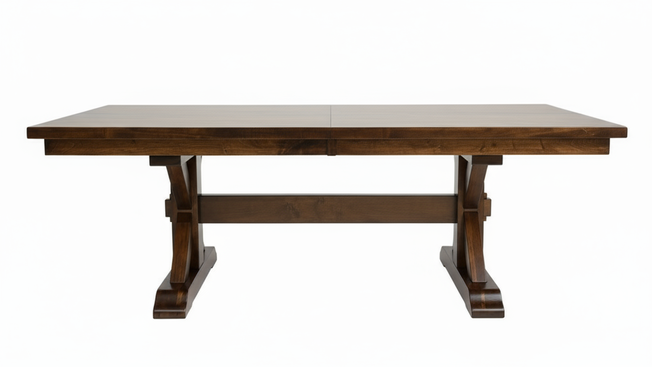 This Amish-made trestle dining table is handcrafted in the USA from 100% solid hardwood. The bold double-pedestal base provides exceptional stability, while the rich hand-applied finish highlights the natural beauty of real wood. Built for everyday meals and holiday gatherings, this table is heirloom quality you can enjoy for generations.
