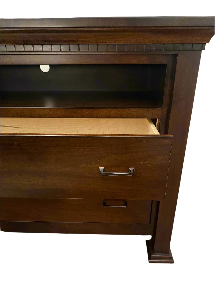 Introducing the Galena Park Media Chest, a stunning combination of style and functionality. Made from solid maple wood with a rich brown finish, this American-made media chest features spacious drawers and an open shelf, providing ample storage for your electronics and media devices. With its durable construction and classic design, this media chest is the perfect addition to any bedroom or living room.