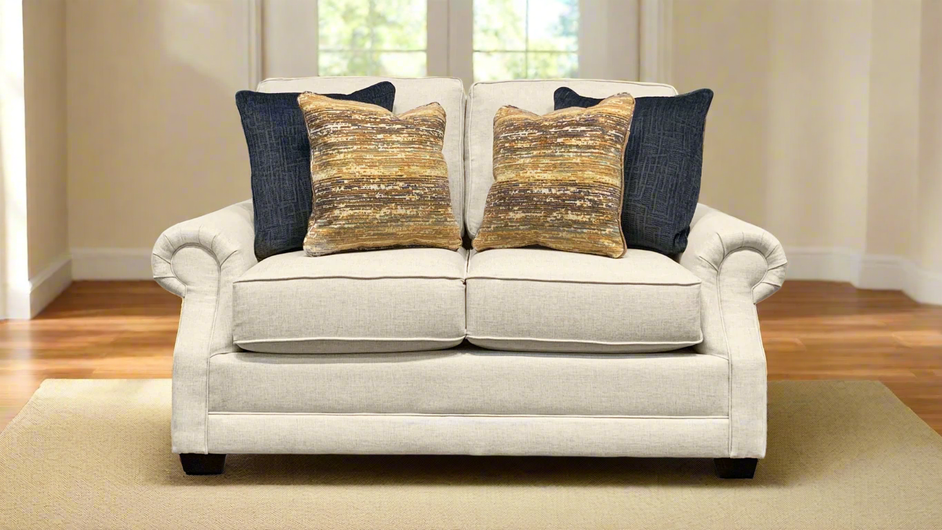 The Mayo Rolled Arm Loveseat blends classic charm with an updated transitional design for timeless appeal. Featuring rolled arms, a two-seat cushion design, and four decorative pillows, this loveseat offers both style and comfort, making it a perfect fit for any living space.