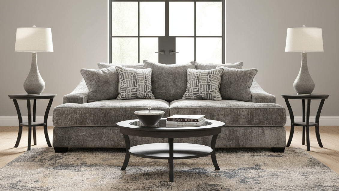 Sink into comfort and contemporary style with this plush, American-made sofa, upholstered in soft grey fabric and accented by stylish patterned pillows. Ideal for cozy evenings and elegant lounging.