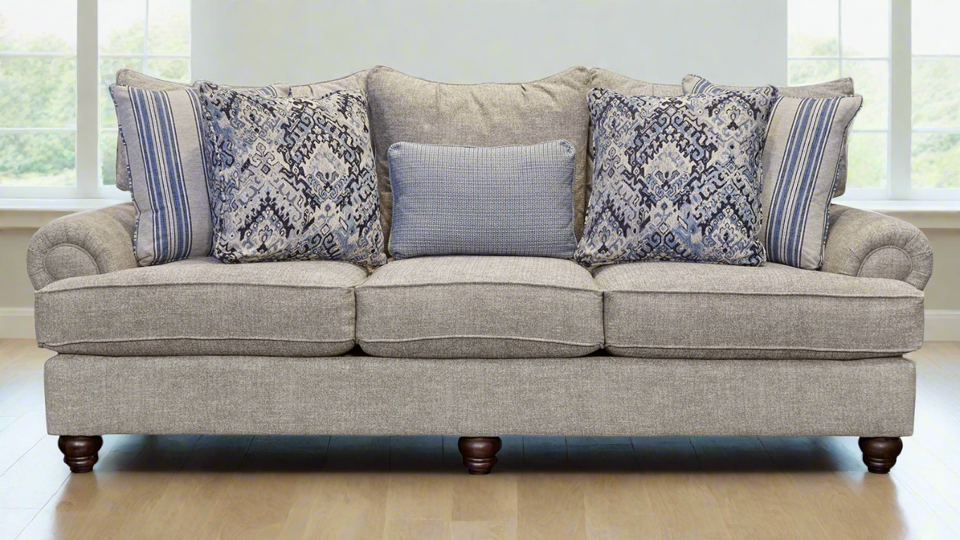 Casual, chic styling makes the Kais Sofa the perfect addition to any living room set. From the neutral, beige-toned upholstery to the rolled panel arms and bun footings, this sofa epitomizes simple elegance in a solid framework. Well-padded seat cushions and pillow-style back cushions feature welt trim and generous proportions, giving you room to get comfortable. Ready for a sofa upgrade? Bring home Kais today!