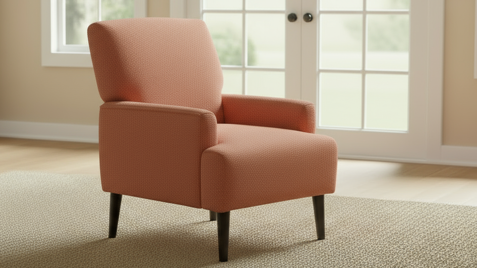 - Upholstered in textured orange bouclé fabric for a bold, stylish look