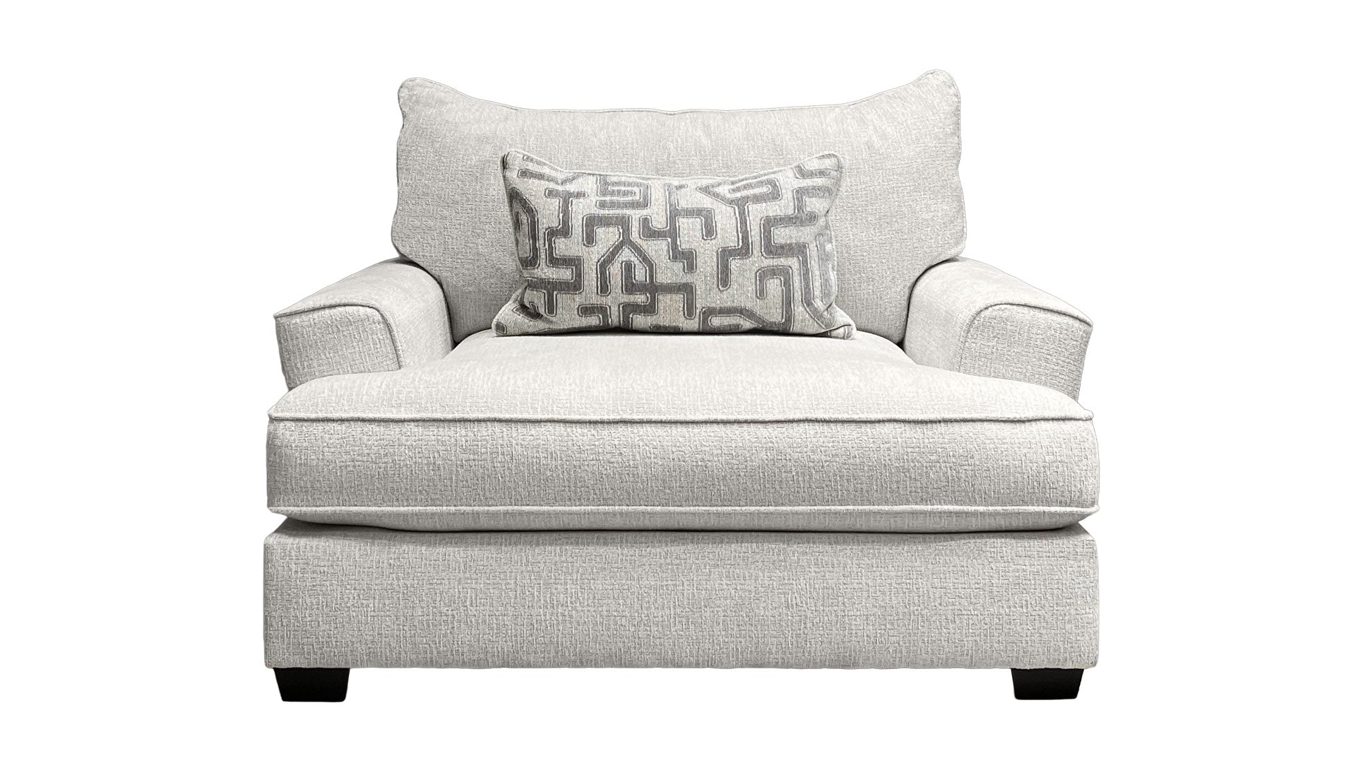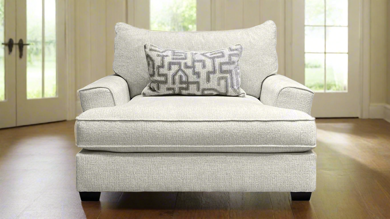 Made in the USA, this chair is designed for comfort and style with a wide, deep seat and plush cushions that invite you to relax. Upholstered in soft, textured fabric, it includes one coordinating accent pillow to complete the look and add support. Perfect as a standalone piece or paired with the matching sofa and loveseat, this chair offers everyday comfort built to last.