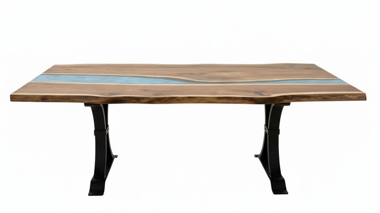 Handcrafted live-edge dining table featuring a solid hardwood top with a poured resin “river” that showcases the natural beauty of the wood. A heavy steel base delivers modern style and rock-solid stability. No two tables are alike—this is a true one-of-a-kind centerpiece for your dining space.