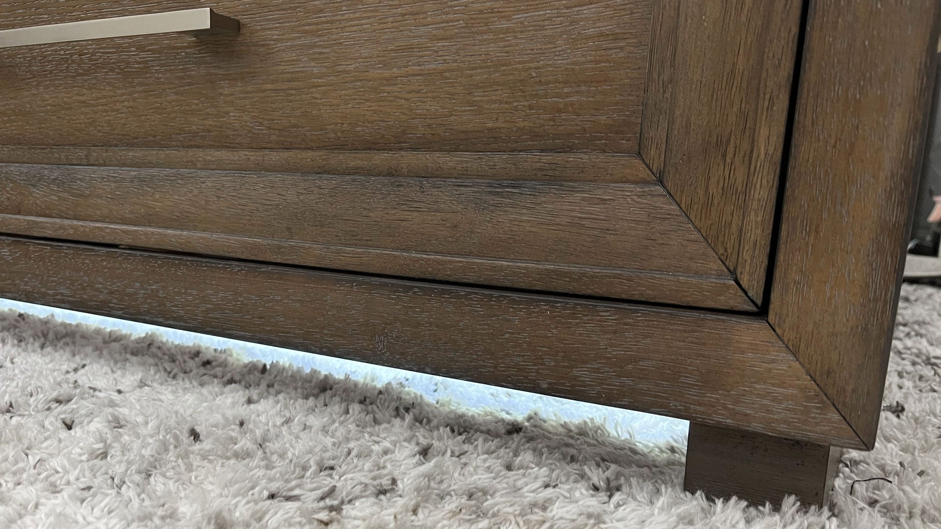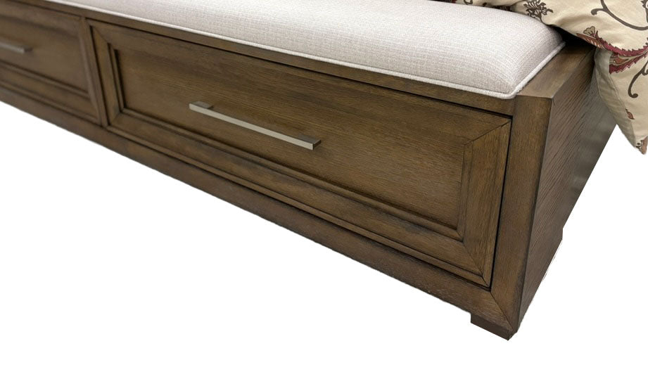 - Bench-Style Upholstered Footboard: Pearl colored upholstered padded footboard with two slide-out storage drawers and under-lit accent lighting.
