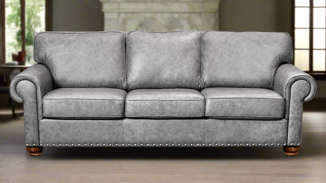 Transform your living room into a haven of comfort and style with the November Sky Sofa. This stunning sofa, crafted with premium top-grain leather, exudes sophistication and offers a luxurious seating experience. The classic design, featuring elegant rolled arms, aged silver nailhead trim, and rich mahogany bun feet, makes a statement in any home. Its generous proportions provide ample seating for family and friends, creating a warm and inviting atmosphere. Built with a sturdy frame and plush, supportive cushions, the November Sky Sofa is designed for lasting comfort and enduring beauty. This American-made sofa is a testament to quality craftsmanship and timeless design.
