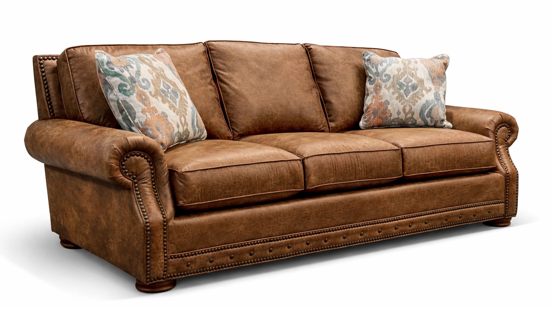 Realize your dream of a home filled with beautiful, warm, sophisticated furniture made to uncompromising standards here in America and capable of transforming a room that is all too ordinary into a destination that is extraordinary. The Palance Chestnut Living Room Collection is inspired by traditional english design while embracing a modern aesthetic and never forgetting the first rule of luxury is that without comfort there is no luxury. Create a living room that exudes class and style while maintaining an inviting presense. The elegant roll of the english arms are highlighted by the antiqued bronze hand set nail head trim which also frames and accentuates the strong geometric essence prominently featured in the angular back and corners. 4 designer pillows add depth and distinction to the simply marvelous silhouette of this sofa. Wait no longer, you deserve this, you have earned it, have it delivered TODAY!