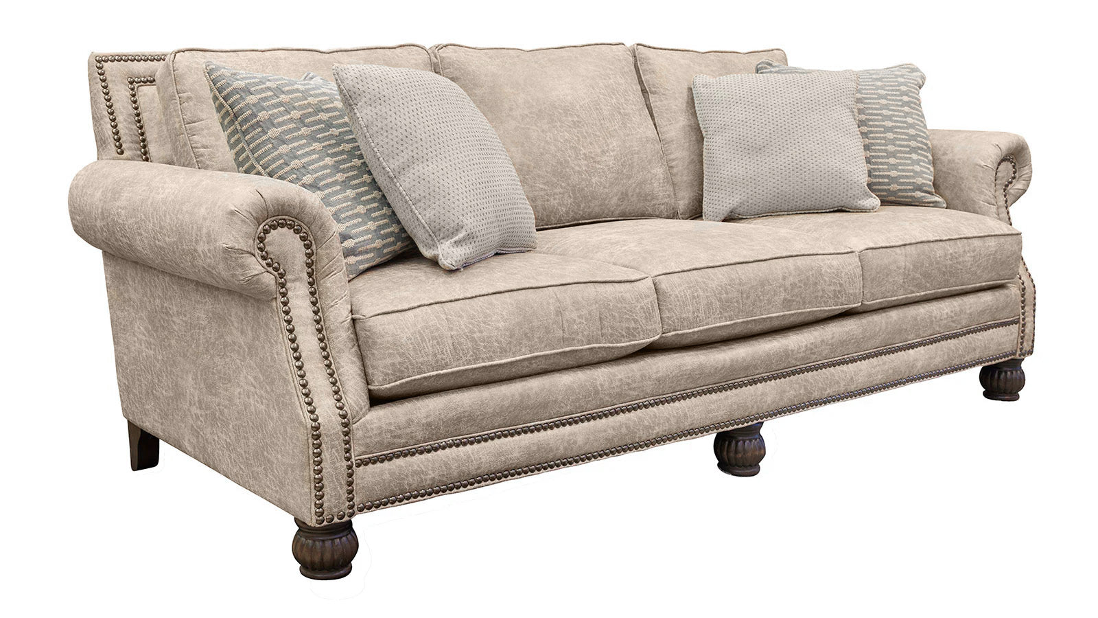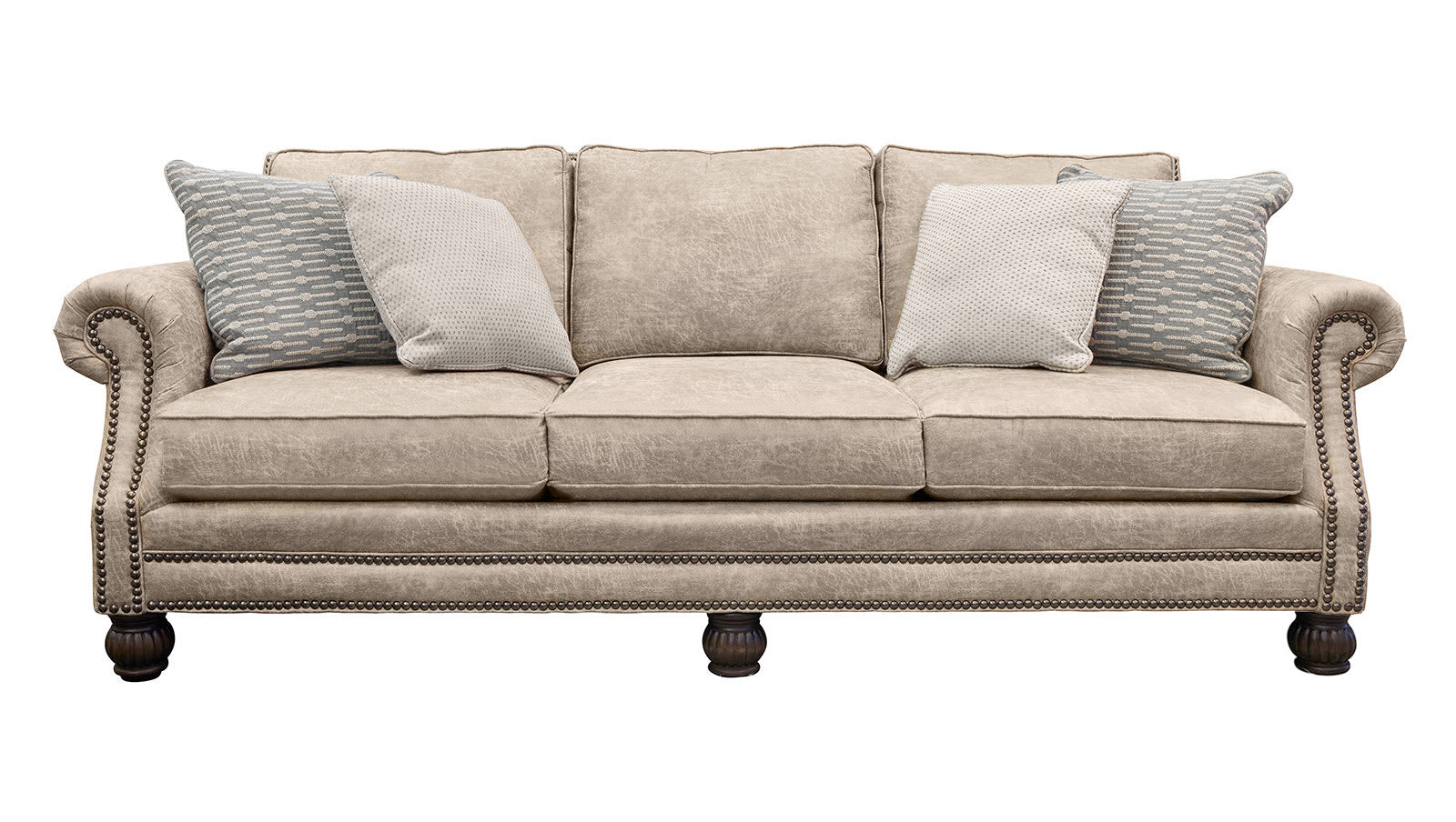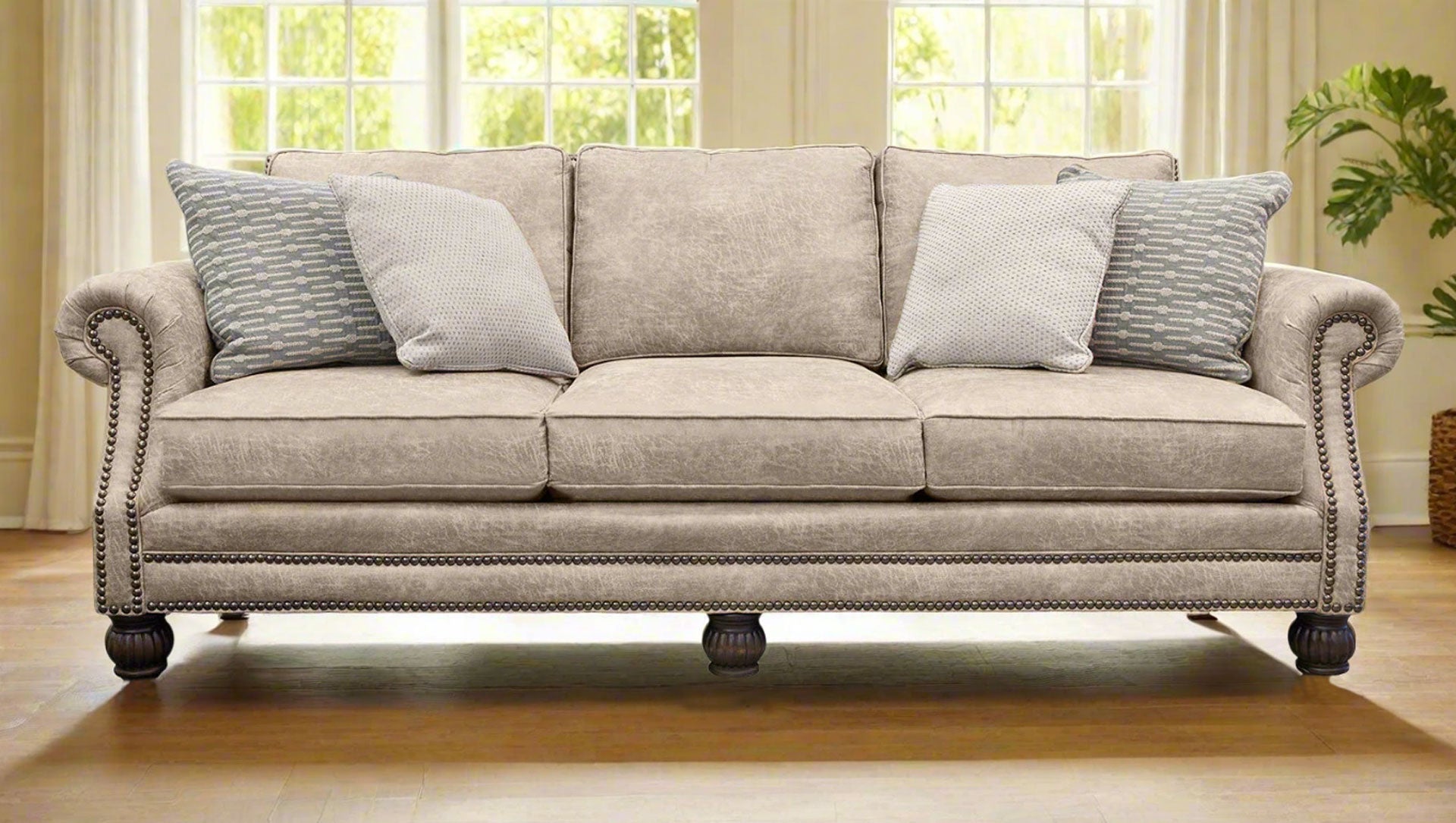 Indulge in the luxurious comfort and sophisticated style of the Palance Marble Hoonah Sofa. This exceptional piece, crafted in Texas, is upholstered in a remarkably durable and easy-to-care-for microfiber fabric that mimics the look and feel of genuine leather. Sink into its plush cushions and experience the ultimate relaxation. The Hoonah Sofa boasts elegant layered arm tops and is adorned with aligned nickel nail heads, adding a touch of refinement to its design. This sofa is built to last and designed to impress, making it the perfect centerpiece for any room.