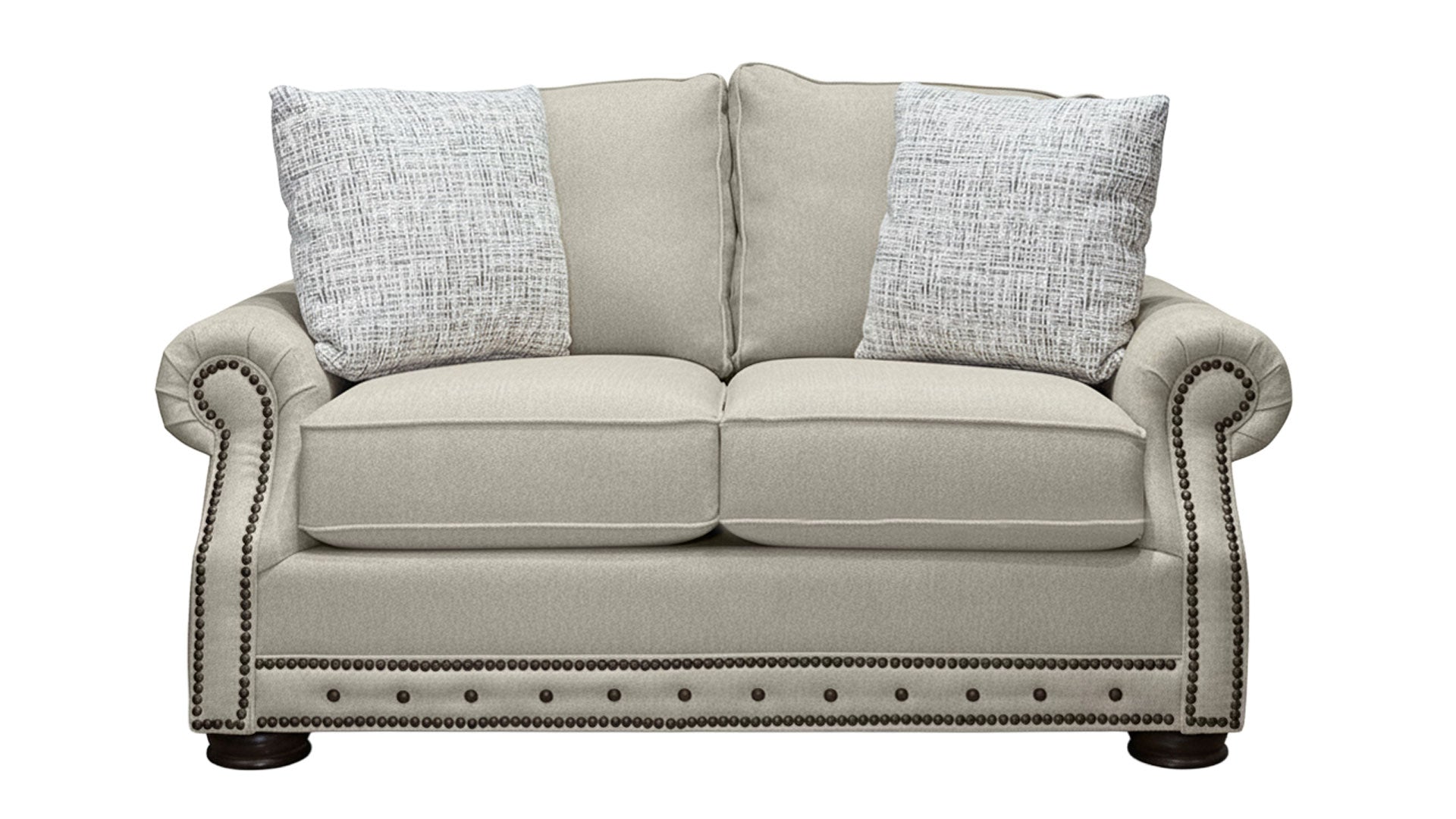This Made in the USA loveseat offers the same comfort, durability, and timeless style as the matching sofa. Upholstered in Macton performance fabric, it is stain-resistant, moisture-repellent, and easy to maintain, making it perfect for families, pets, and everyday living. Rolled arms with nailhead trim and plush cushions create a warm, classic look. Decorative accent pillows included.